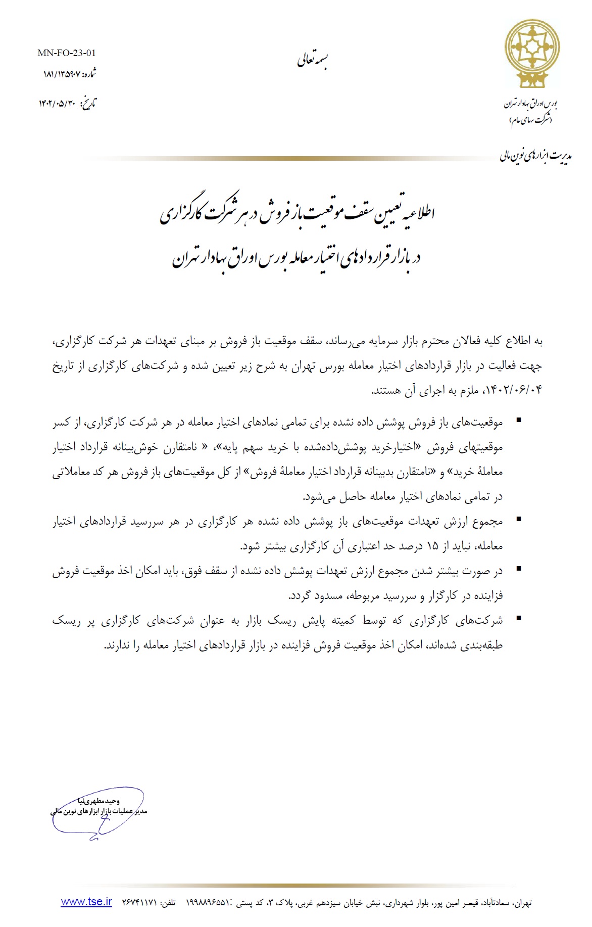 – شرکتهای کارگزاری که توسط کمیته پایش و ریسک بازار به عنوان شرکتهای کارگزاری پر ریسک طبقهبندی شدند، امکان اخذ موقعیت فروش فزاینده در بازار قراردادهای اختیار معامله را ندارند.