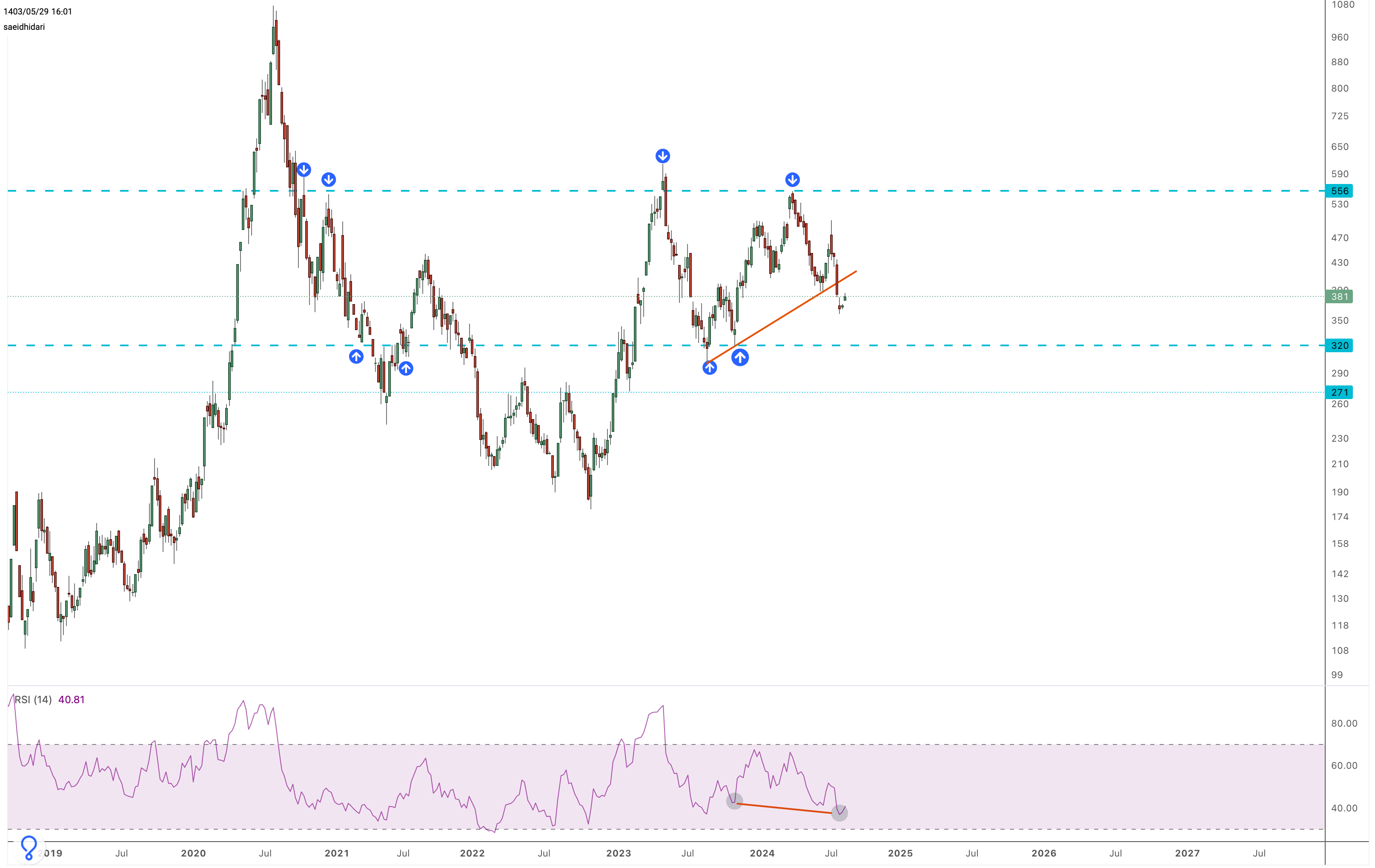 در نمودار هفتگی سیمان کردستان با توجه به شروع روند اصلاحی از اردیبهشت ۱۴۰۲ قیمت در محدوده مقاومت ۹۸۰۰ و حمایت ۷۰۰۰ ریال بیش از یک سال در حال نوسان می باشد.