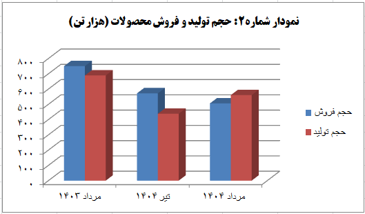حجم فروش محصولات در مرداد ۱۴۰۴ نسبت به دوره مشابه آن در سال گذشته با افت ۳۳ درصدی و نسبت به ماه گذشته آن (تیر ۱۴۰۴) با کاهش ۱۲ درصدی همراه بود.
