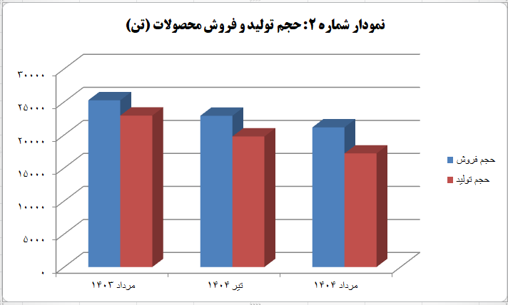 حجم فروش محصولات این شرکت در مرداد ۱۴۰۴ نسبت به دوره مشابه آن در سال گذشته با افت ۱۶ درصدی و نسبت به ماه گذشته آن (تیر ۱۴۰۴) با کاهش ۸ درصدی همراه بود.