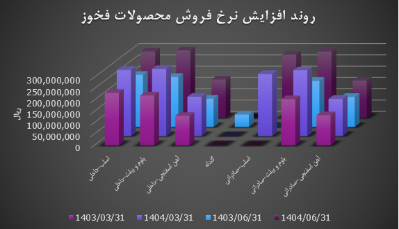 همچنانکه در نمودار زیر مشاهده می شود، محصولات اسلب، بلوم و بیلت و آهن اسفنجی در دو بازار داخلی و صادراتی عرضه می شوند. فخوز در بازار داخلی طی سه ماهه نخست سال جاری از محل عرضه اسلب در دو بازار داخلی و صادرات به ترتیب ۵۹ هزار میلیارد ریال و ۱۹ هزار میلیارد ریال کسب نمود درحالی که در سه ماهه نخست سال گذشته اسلب هیچگونه فروشی در بازار صادراتی نداشته است.