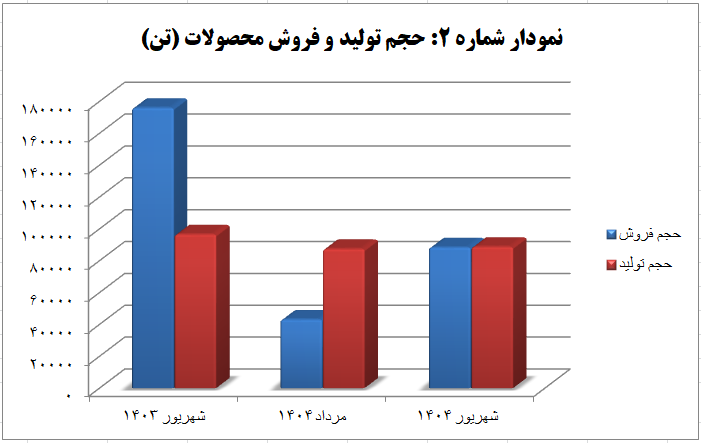 نمودار شماره دو، روند تغییرات حجم تولید و فروش محصولات این شرکت را در بازههای زمانی مذکور در گزارش به تصویر میکشد.