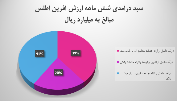 در این راستا، شرکت به عنوان پشتیان تحول دیجیتال بانک ملت در جهت تعریف فرآیندهای جدید اقدام کرد که نتیجه آن در شش ماهه منتهی به تیر ماه سال جاری کسب درآمد عملیاتی ۴۸۲ میلیارد ریالی با رشد ۲۴۱ هزار میلیارد ریال بود که شامل ۱۸۸ میلیارد ریال درآمد حاصل از ارائه خدمات مشاوره ای به بانک ملت، ۹۸ میلیارد ریال درآمد حاصل از تدوین و توسعه پلتفرم خدمات بانکی و ۱۹۶ میلیارد ریال درآمد حاصل از توسعه سکوی دستیار هوشمند بانک بود.