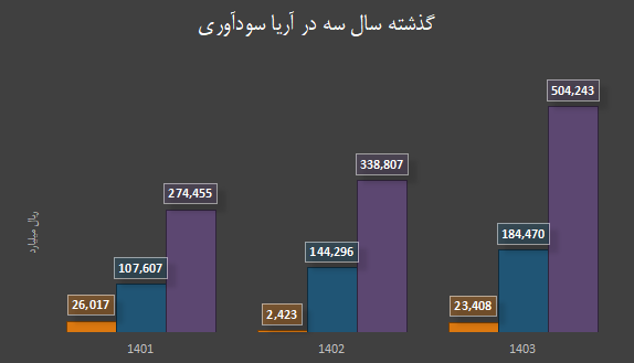 آریا در کنار عملیات تولیدی، از محل سایر درآمدها نیز مبلغ ۲۶ هزار میلیارد ریال در سال ۱۴۰۱، مبلغ ۲ هزار میلیارد ریال در سال ۱۴۰۲ و مبلغ ۲۳ هزار میلیارد ریال در سال ۱۴۰۳ دریافت کرد که سود عملیاتی را بهبود بخشید. این شرکت باتوجه به ثابت بودن سرمایه طی سه سال مذکور، سود هر سهم را به رقم ۸ هزار و ۱۸ ریال در سال ۱۴۰۱، مبلغ ۸ هزار و ۵۷ ریال در سال ۱۴۰۲ و مبلغ ۱۰ هزار و ۲۳۸ ریال در سال ۱۴۰۳ رساند که طی سالهای مذکور، سود تقسیمی نیز به میزان ۹۴ درصد، ۸۹ درصد و ۱۰۰ درصد (سال ۱۴۰۳) تصویب و پرداخت شد.