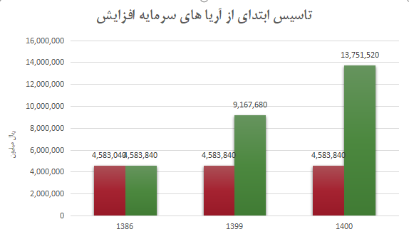 این نتایج عملکردی در سه سال گذشته به واسطه آخرین افزایش سرمایه در سال ۱۴۰۰ محقق شد. شرکت پلیمر آریا ساسول از ابتدای تاسیس تا پیش از سال ۱۴۰۰، تنها دو مرتبه اقدام به افزایش سرمایه کرد. اولین افزایش سرمایه شرکت در سال ۱۳۸۶ از محل مطالبات سهامداران صورت گرفت که نتیجه آن رشد سرمایه به میزان ۴ هزار و ۵۸۳ میلیارد ریال بود. در سال ۱۳۹۹ نیز دومین افزایش سرمایه آریا به ارزش ۴ هزار و ۵۸۴ میلیارد ریال از محل سود انباشته انجام شد و سرمایه شرکت دو برابر گردید. در آخرین افزایش سرمایه که به سال ۱۴۰۰ مربوط می شود، مبلغ افزایش سرمایه همچون سال گذشته به ارزش ۴ هزار و ۵۸۴ میلیارد ریال از محل سود انباشته صورت گرفت که ۵۰ درصد سرمایه را رشد داد.