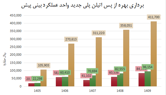 با بهره برداری از پروژه پلی اتیلن جدید، شرکت میتواند با قیمت فروش ۹۸۸ دلار به ازای هر تن (با نرخ تسعیر ۷۹ هزار و ۴۰۰ تومان) و میزان تولید پیش بینی شده براساس رانمان تولید، طی ۵ سال پس از بهره برداری به درآمد قابل توجهی از فروش محصولات این واحد دست یابد که در نمودار زیر به تصویر کشیده شده است. به این ترتیب، آریا با فروش محصولات در نیمه دوم ۱۴۰۵ مبلغ ۱۰۶ هزار میلیارد ریال و در سال ۱۴۰۶ مبلغ ۲۷۱ هزار میلیارد ریال را کسب خواهد تا در نهایت به مبلغ ۴۱۲ هزار میلیارد ریال در سال ۱۴۰۹ دست یابد.