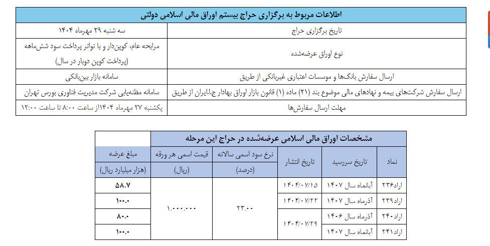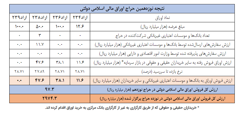 اعلام نتایج موفقیتآمیز نوزدهمین حراج اوراق دولتی و تعیین تکلیف حراج بیستم برای ۲۹ مهرماه.