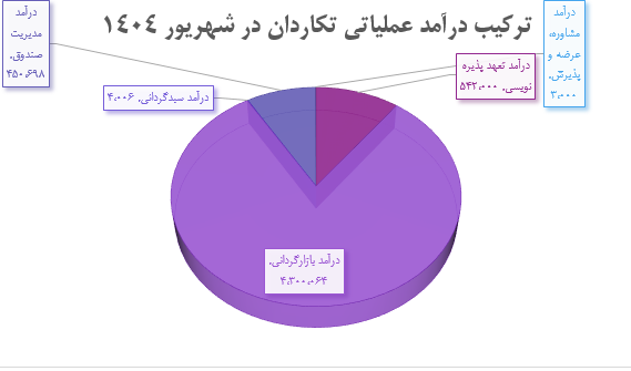 به طور کلی، تکاردان در ۹ ماهه منتهی به شهریور ماه امسال ارزش درآمد عملیاتی خود را با رشد ۳۵ درصدی نسبت به دوره مشابه سال گذشته به رقم ۳۰ هزار و ۲۲۱ میلیارد ریال رساند که درآمد تعهد پذیره نویسی به رقم ۱ هزار و ۶۶۴ میلیارد ریال و درآمد مشاوره، عرضه و پذیرش به ارزش ۴۷ میلیارد ریال محقق شدند. همچنین درآمد بازارگردانی با رشد ۳۷ درصدی به رقم ۲۴ هزار و ۸۰۳ میلیارد ریال و درآمد مدیریت صندوق با افزایش ۵۰ درصدی به رقم ۳ هزار و ۴۶۹ میلیارد ریال صعود کرد. درآمد ۹ ماهه حاصل از سبدگردانی نیز با رشد ۱۳۱ درصدی به ارزش ۲۳۷ میلیارد ریال رشد یافت.