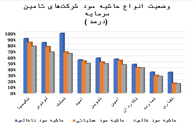 وضعیت انواع حاشیه سود شرکتهای تامین سرمایه در نمودار قابل مشاهده است. همانطور که در نمودار نیز مشخص است عموم شرکتهای این گروه از نظر انواع حاشیه سود وضعیت نسبتا خوبی دارند.