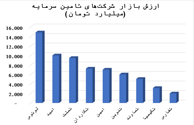 - ارزش بازار: ارزش بازار ۹ شرکت بورسی تامین سرمایه در ایران اکنون حدود ۶۴ هزار میلیارد تومان است.