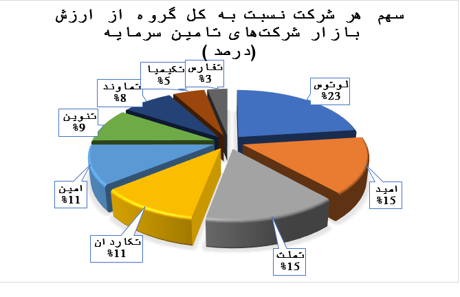 لوتوس بزرگترین و تفارس کوچکترین شرکت این گروه محسوب میشود. برای درک بهتر، در ادامه به صورت نمودار دایرهای نیز ارزش بازار شرکتهای تامین سرمایه مورد مقایسه قرار گرفته است.