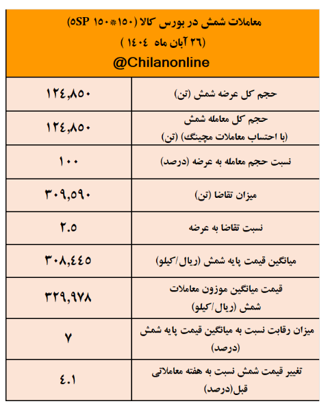در معاملات ۲۶ آبان ۱۴۰۴ بورس کالا، عرضه ۱۲۴ هزار تن شمش بلوم 5sp با تقاضای ۲.۵ برابری بهطور کامل معامله شد و میانگین قیمت آن رشد ۴.۱ درصدی داشت.