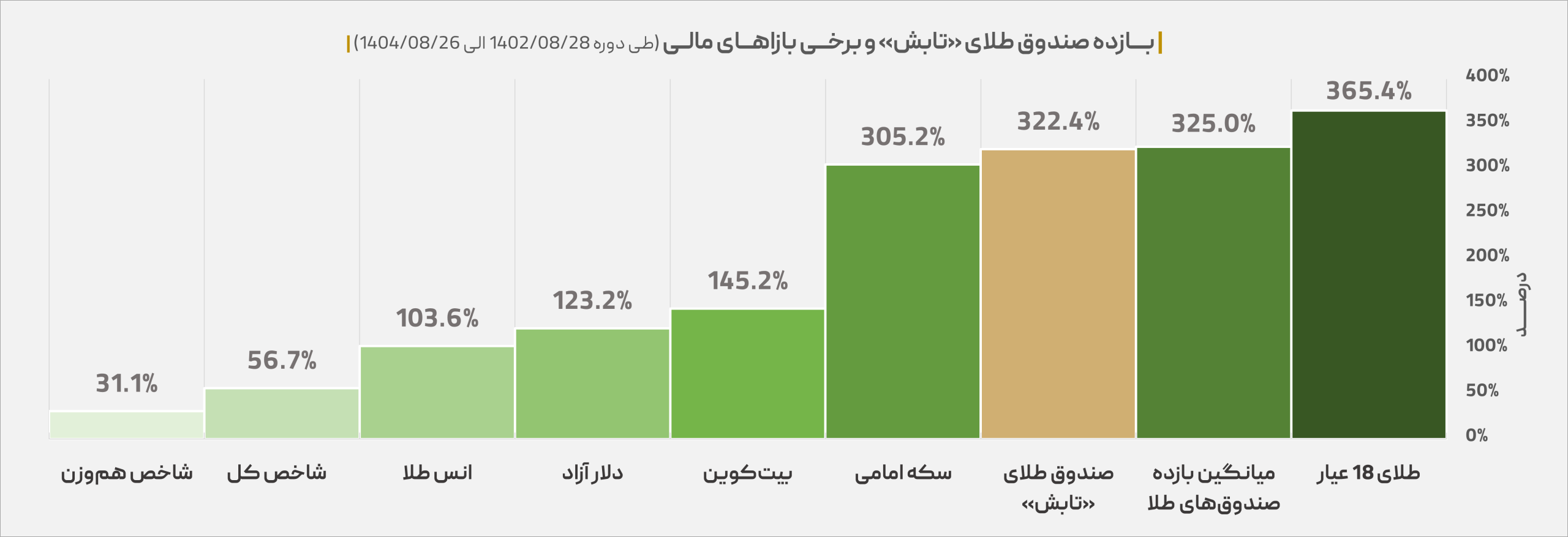 مقایسه این بازدهیها با سایر بازارها نشان میدهد ارزش واقعی عملکرد صندوقتابش روشنتر میشود. در این دوره، سکه امامی ۳۰۵.۲ درصد، بیتکوین ۱۴۵.۲ درصد و دلار بازار آزاد ۱۲۳.۲ درصد رشد داشتهاند، در حالیکه شاخص کل بورس تنها ۵۶.۷ درصد و شاخص هموزن ۳۱.۱ درصد بازدهی داشته است. این دادهها نشان میدهد بازدهی صندوقطلایتابش نهتنها پوشش کاملی در برابر تورم ایجاد کرده، بلکه با اختلاف قابل توجهی از بازارهای ارز و بورس پیشی گرفته و بازدهی تقریباً سه برابری نسبت به انس جهانی طلا (۱۰۳.۶ درصد) کسب کرده است.