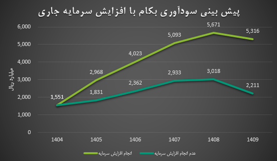 در صورتی که این افزایش سرمایه طبق پیشنهاد بکام طی دو مرحله انجام شود، میتواند با دوره بازگشت دو سال و ۶ ماه و ۲۰ روز، بازده ۳۶.۳۹ درصدی را برای سهامداران به ارمغان آورد که باتوجه به بزرگتر بودن این نرخ نسبت به نزخ تنزیل، این پیشنهاد افزایش سرمایه برای سرمایه گذاران از صرفه اقتصادی برخوردار است؛ چراکه در طی ۵ سال آینده سود آوری مطلوبی را به همراه خواهد داشت و ارزش فعلی آن ۶۰۳ میلیارد ریال برآورد می شود.