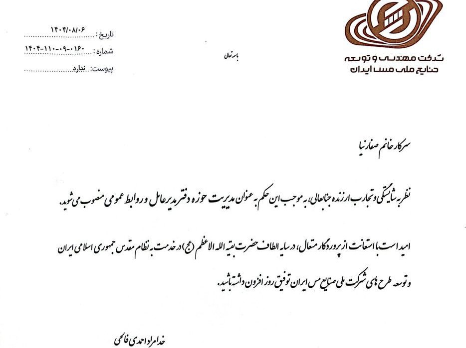مدیرعامل شرکت مهندسی و توسعه صنایع ملی مس ایران با صدور حکمی، نفیسه صفارنیا را بهعنوان مدیر حوزه مدیرعامل و روابط عمومی شرکت مهندسی و توسعه [...]