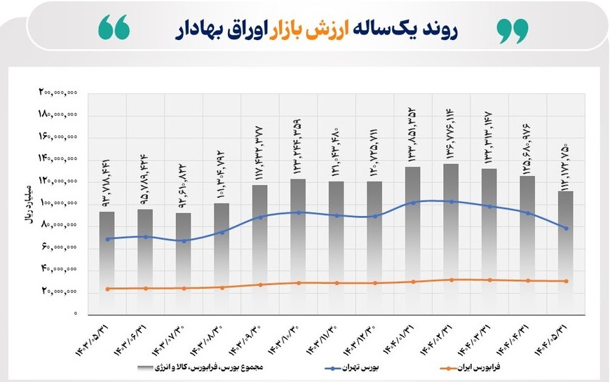 دادههای آماری گزارش مدیریت پژوهش، توسعه و مطالعات اسلامی سازمان بورس و اوراق بهادار از روند یکساله ارزش بازار اوراق بهادار در ۴ بورس فعال ایران، نشان میدهد: مجموع ارزش بازارهای اوراق بهادار در بورس تهران، فرابورس ایران، بورس انرژی و بورس کالا در پا,...