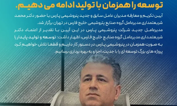 مدیرعامل جدید پتروشیمی پارس، بر توسعه همزمان با تولید و تطبیق نظام مدیریتی با شرایط تحریم تأکید کرد و اجرای دو مگاپروژه ملی را در دستور کار قرار داد.,...
