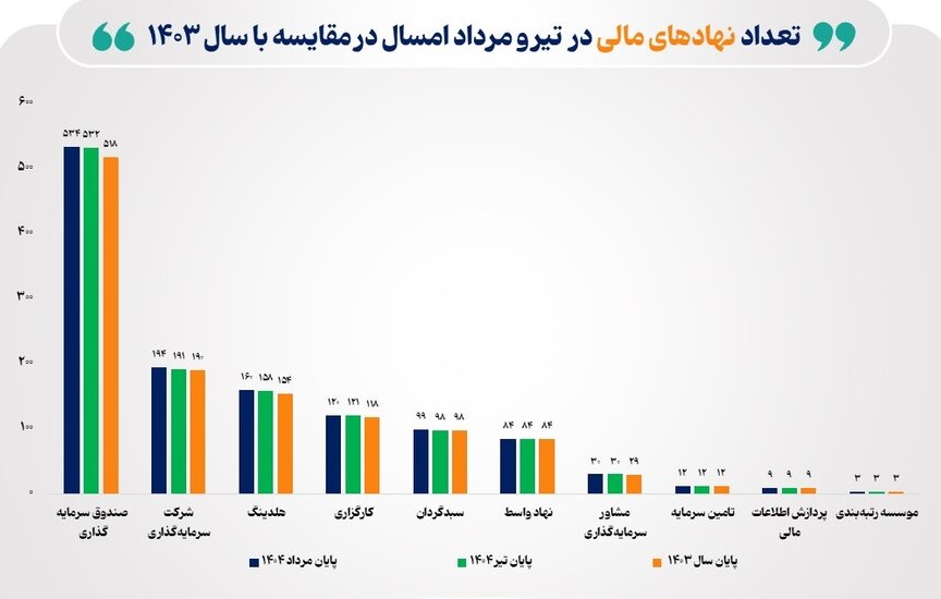 در مرداد ماه ۱۴۰۴، با صدور مجوز فعالیت برای ۷ نهاد مالی جدید، تعداد کل نهادهای مالی تخصصی به ۱۲۴۵ رسید. صندوقهای سرمایهگذاری با سهمی بیش از ۴۲ درصد و تعداد ۵۳۴ فقره، همچنان بیشترین سهم را در میان نهادهای مالی دارند و تعداد شرکتها و هلدینگهای سرما,...