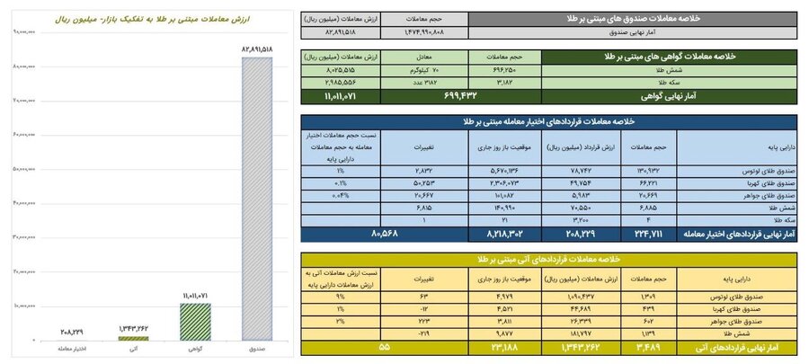 در روز ۲۱ مرداد ماه در معاملات بازار ابزارهای مبتنی بر طلای بورس کالای ایران، در مجموع ۳۵۴ میلیون و ۳۳۹ هزار و ۵۹۴ واحد صندوقهای مبتنی بر طلا، به ارزش حدود ۲ همت معامله شد.,...