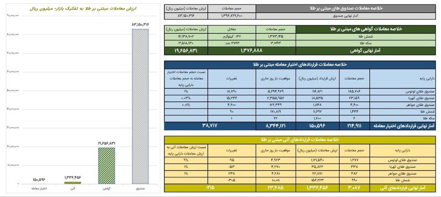 معاملات بازار ابزارهای مبتنی بر طلای بورس کالای ایران در روز ۴ مرداد، مجموعا ۸۳۷ میلیون و ۵۵۶ هزار واحد صندوقهای مبتنی بر طلا به ارزش بیش از ۳ همت معامله شد.,...